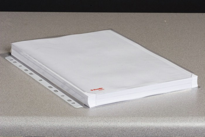 Formátu A4 s rozšířenou kapacitou. Vhodné pro zakládání katalogů, ceníků a objemnějších dokumentů. Vyrobeny z pevného hladkého PVC tloušťky 170 mic. Spodní a boční „klínek“ o šířce 20 mm zvyšuje kapacitu kapsy, otevřené spodní rohy kapes zajistí, že se rohy vašich objemnějších dokumentů v kapse neohnou a nezničí. Multiperforace je zesílena bílým plastovým proužkem a je vhodná pro založení kapsy do pákového i kroužkového pořadače. Kapacita kapes je až 200 listů papíru 80 g/m2.