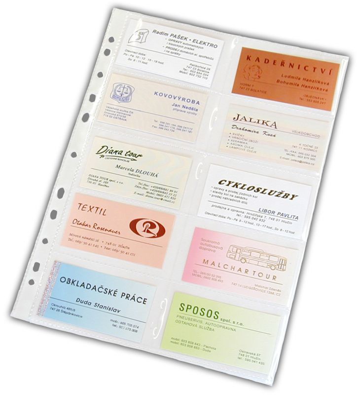 Náhradní složky na 20 vizitek do kroužkových vizitkářů. Vyrobeno z polypropylenu síla 80 mic.