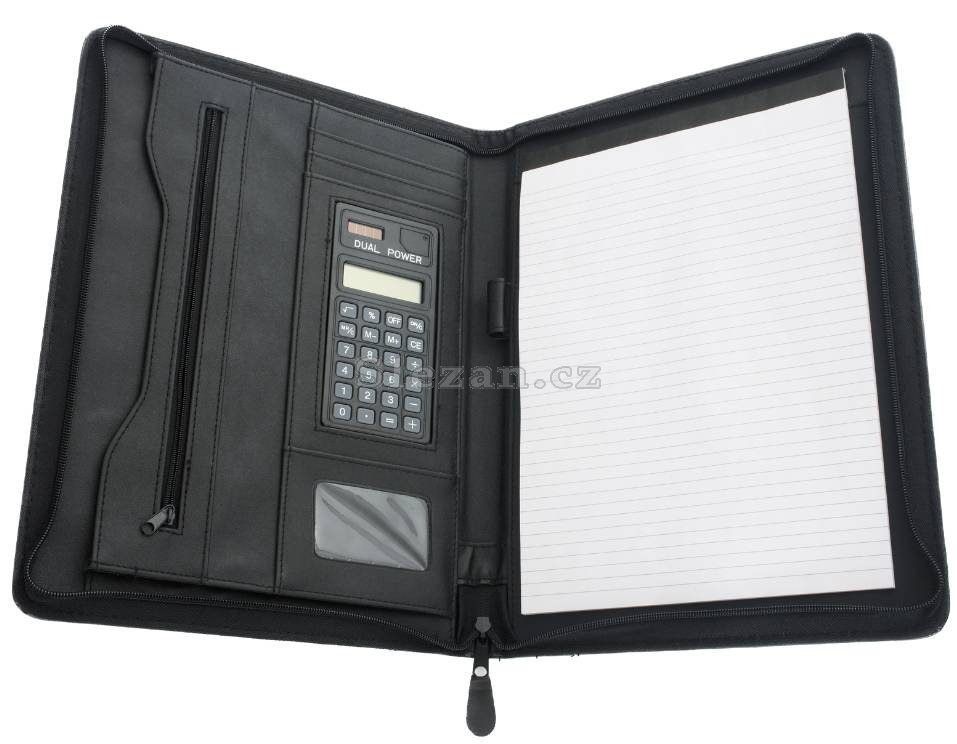 Klasické portfólio na dokumenty, vybavené blokem na poznámky s klipem, kalkulačka, přihrádkami na platební karty nebo vizitky.