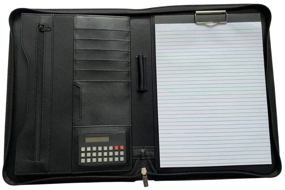 Klasické portfólio na dokumenty, vybavené blokem na poznámky s klipem, kalkulačkou, přihrádkami na platební karty nebo vizitky, poutkem na psací potřeby.