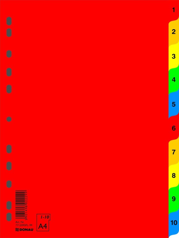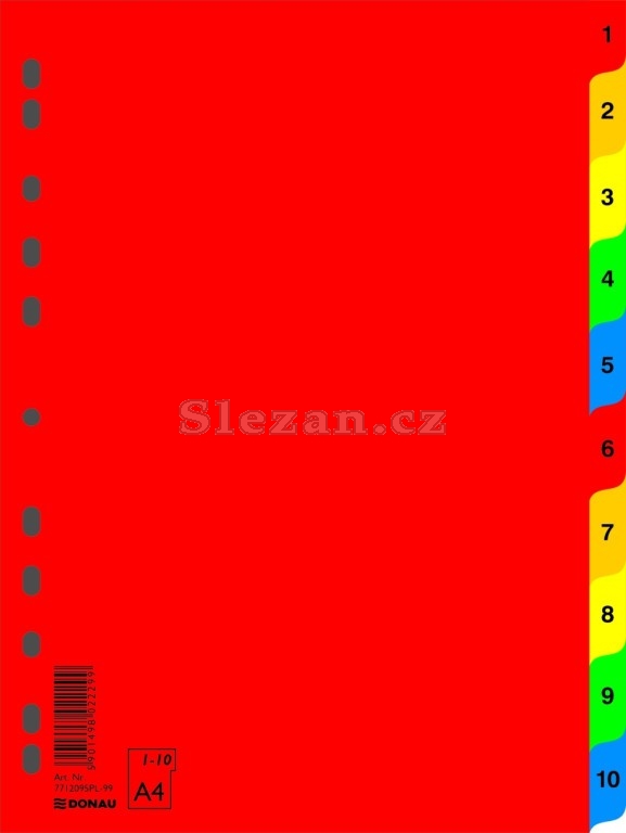 Rozlišovače ve výrazném červeném designu s euroděrováním a barevnými záložkami, označenými předtištěnými číslicemi 1-10.