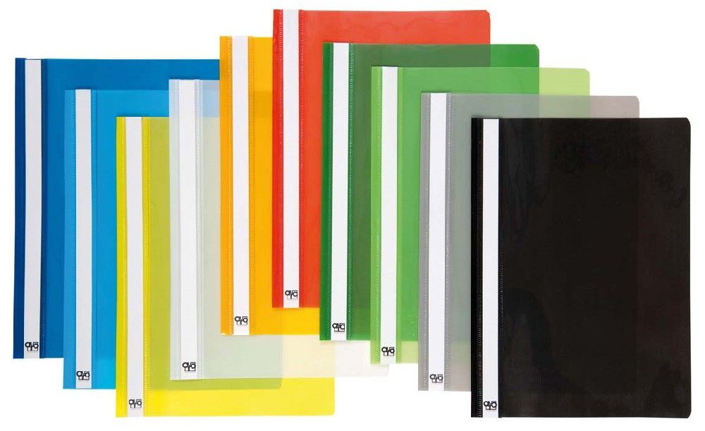 Plastový, formát A4. Průhledná přední strana.