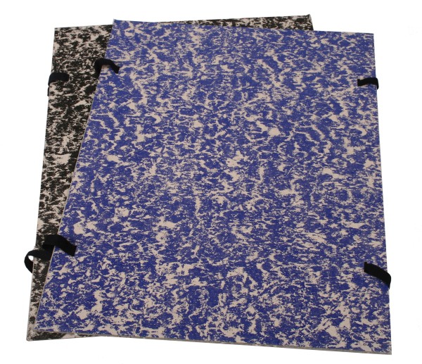 Tvrdý kartón s tkanicí bez hřbetu. Modrá barva nebo černá barva.