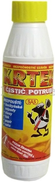 Použití: Za stálého tlaku na uzávěr otvírejte ve směru šipky. Do sifonu umývadla, výlevky, vany, WC nalijte přibližně půl litru velmi horké vody. Poté vsypte 2-3 víčka Krtka, v závislosti na velikosti sifonu. Nechte působit asi 10 minut a pak propláchněte horkou vodou a průchodnost odpadu zkontrolujte větším proudem tekoucí vody. Při větším zanesení zopakujte po dvou dnech, preventivně po dvou týdnech.