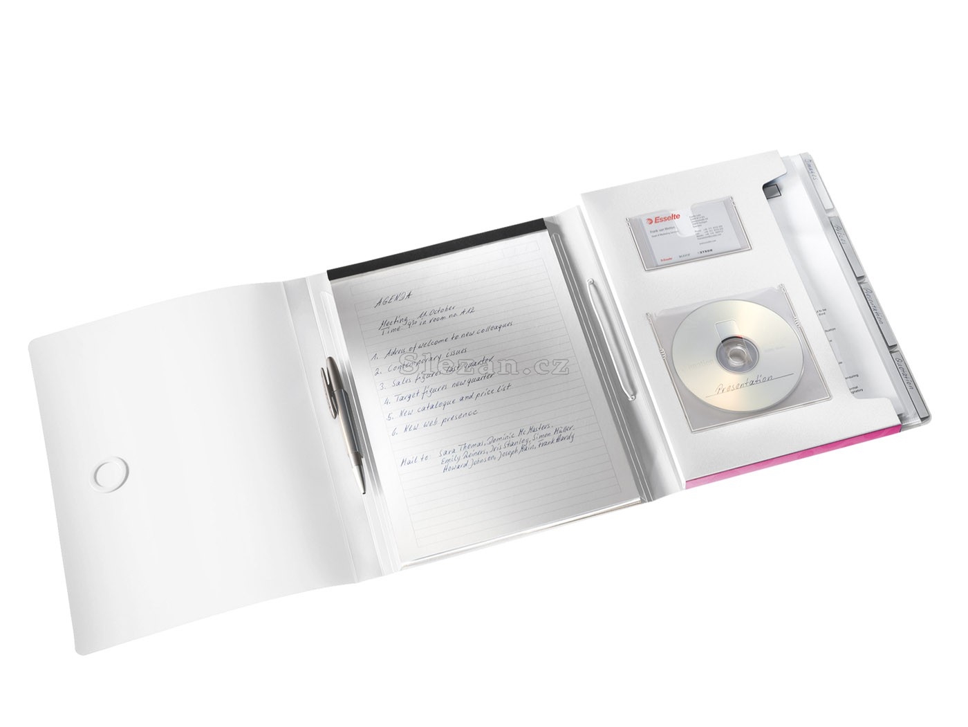 - Součástí organizéru je linkovaný blok na psaní A4 s mikroperforací (40 listů) a úchyt na propisku