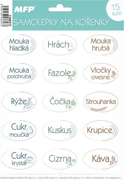 Vaší kuchyni! Aršík obsahuje 15 samolepek: hladká mouka, polohrubá mouka, hrubá mouka, hrách, fazole, ovesné vločky, rýže, čočka, strouhanka, cukr moučka, cukr krystal, kuskus, krupice, cizrna, káva