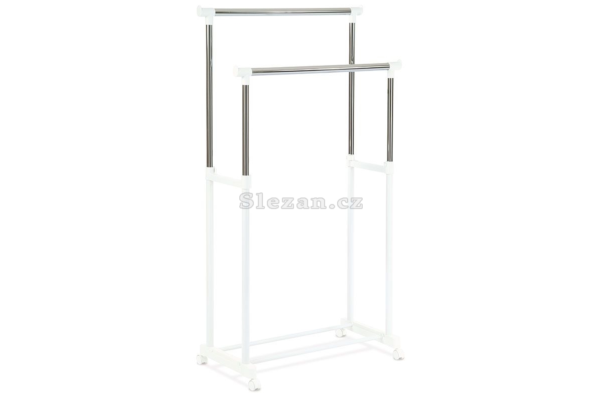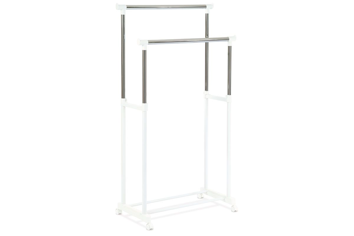 Stojan na šaty na kolečkách v provedení bílá/chrom s 2 odkládacími rameny.