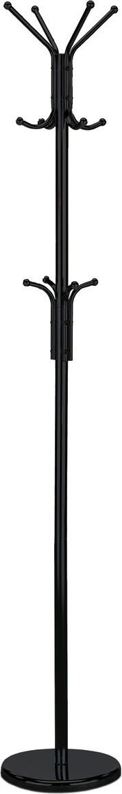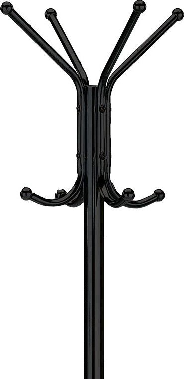 Kovový, volně stojící věšák v retro stylu a se závěsnými háčky ve dvou výškových úrovních. Háčky jsou zakončeny plastovými kulatými záslepkami z černého plastu. Stabilní a lehká konstrukce je z kovových trubek v černém matném práškovém laku a zakončena kovovou podestou se zátěží. Dodáván je v demontovaném stavu. Výška je 182 cm, celková nosnost je do 10 kg rovnoměrně rozprostřené zátěže. Díky své hmotnosti a provedení je lehce přenosný. Jedná se originální doplněk interiéru, v každém si najde zasloužené a funkční místo a uplatnění.