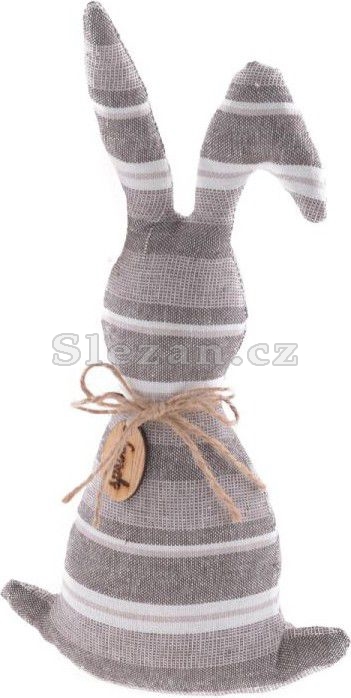 Velikonoční dekorace ideální pro jarní aranžná vašeho domova. Zajíc je z bavlněné látky s proužky v přírodních barvách. Je ozdobený mašličkou z jutového provázku s dřevěnou cedulkou s nápisem "Spring". Tělo je vyplněno vatou, spodní část je vyplněna kuličkami pro lepší stabilitu. Velikost: v. 26 cm, š. 14cm Cena je uvedena za 1 kus.