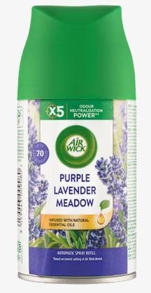 Barevné fúze přírodní levandule a bergamotu končící nádechem červené pelargónie. Posilte vůni příběhu Vašeho domova s automatickým sprejem od Air Wick Freshmatic. Barevná směs přírodní levandule a bergamotu s dotekem červené pelargonie. Air Wick Freshmatic uvolňuje dávky nepřetržité svěží vůně, takže Váš domov vždy přívětivě voní.