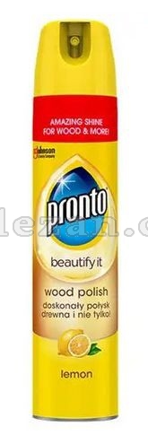 Pronto Lemon zvyšuje lesk a oživuje vzhled většiny tvrdých povrchů v celé domácnosti. Vlastnosti Pronto Lemon sprej proti prachu: Odstraňuje prach a otisky prstů a šmouhy. Vytváří lesklou ochrannou vrstvu, aniž by na povrchu zanechával voskovitý film. Vhodný pro dřevěný nábytek a kůži s povrchovou úpravou, žulu, nerezovou ocel, laminát, křemen a další. S vůní citronu. Balení ve spreji. Použití Pronto proti prachu: Neotáčejte víčkem. Před použitím protřepejte. Držte nádobku ve svislé poloze a nastříkejte ze vzdálenosti 20 cm na čištěný povrch. Vyleštěte měkkým suchým a čistým hadříkem. Pro čištění malých částí nastříkejte přípravek na hadřík a povrch vyleštěte. Nepoužívejte na podlahy, vnitřní povrch vany, dřevo bez povrchové úpravy. Doporučujeme otestovat účinek přípravku na malém, skrytém místě. Složení Pronto Lemon: <5% neiontové povrchově aktivní látky, 5-15% alifatické uhlovodíky, parfémy, limonene, citral, geraniol, 2-bromo-2-nitropropane-1,3-diol.
