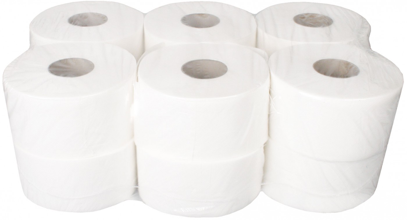 Bílý toaletní papír vyroben z celulózy. 2 vrstvy. Průměr 19 cm. 12 ks v balení.