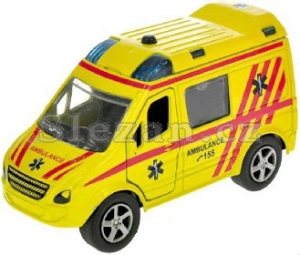 Realisticky vypadající model českého výjezdového žlutého vozidla ambulance z kovu a plastu, na baterie, se světlem a zvukem. Hračka česky mluvící (Uvolněte nám cestu, prosím. V případě zranění volejte číslo 155. Záchranná služba, už jedeme.)