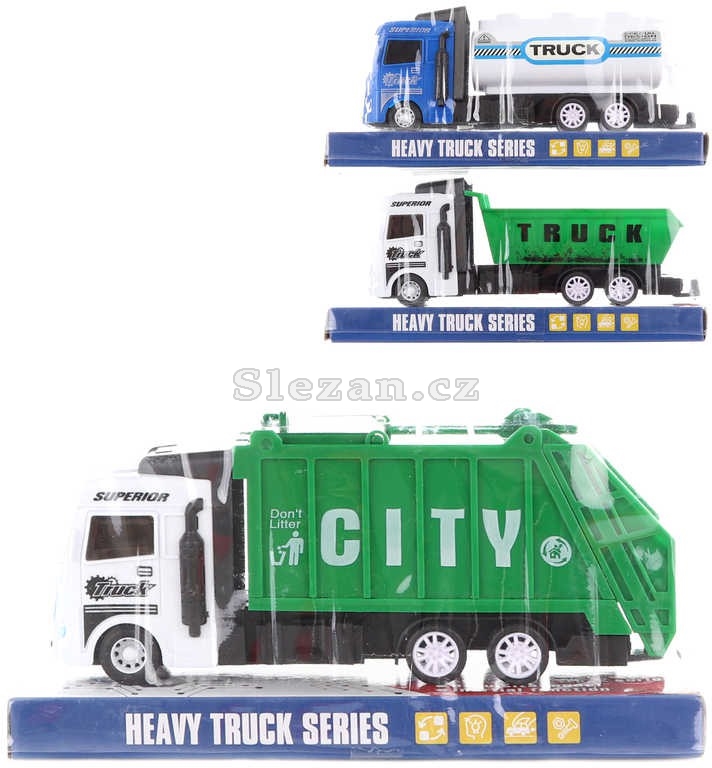 Svoz komunálního odpadu, auto náklaďák s korbou, cisterna.