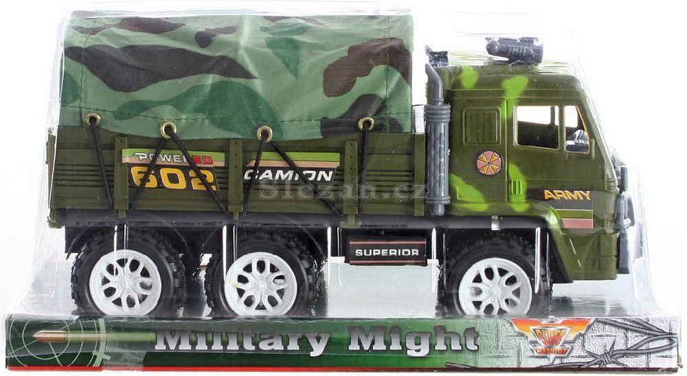 Parádní army vojenské maskované auto z plastu, s plachtou, s potiskem "maskáč", pro všechny malé vojáky. Plachta je připevněna pomocí gumiček a lze ji sundat. Pohon na setrvačník.
