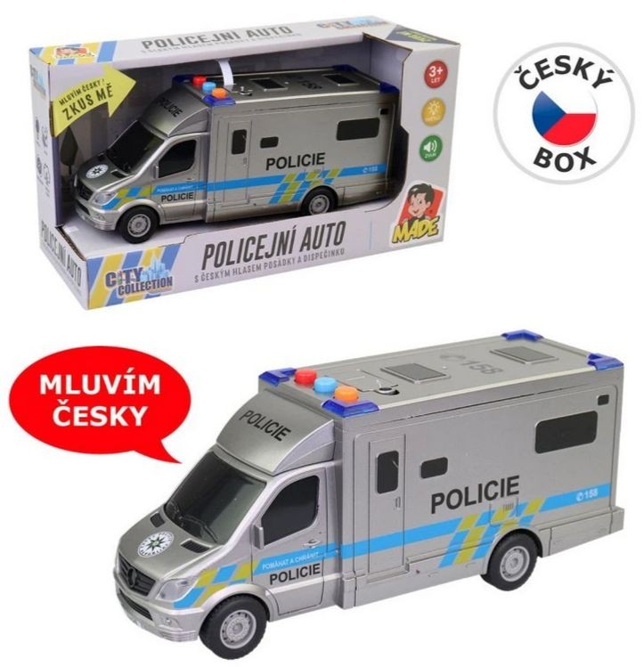 Policejní auto s českým hlasem posádky a dispečinku.