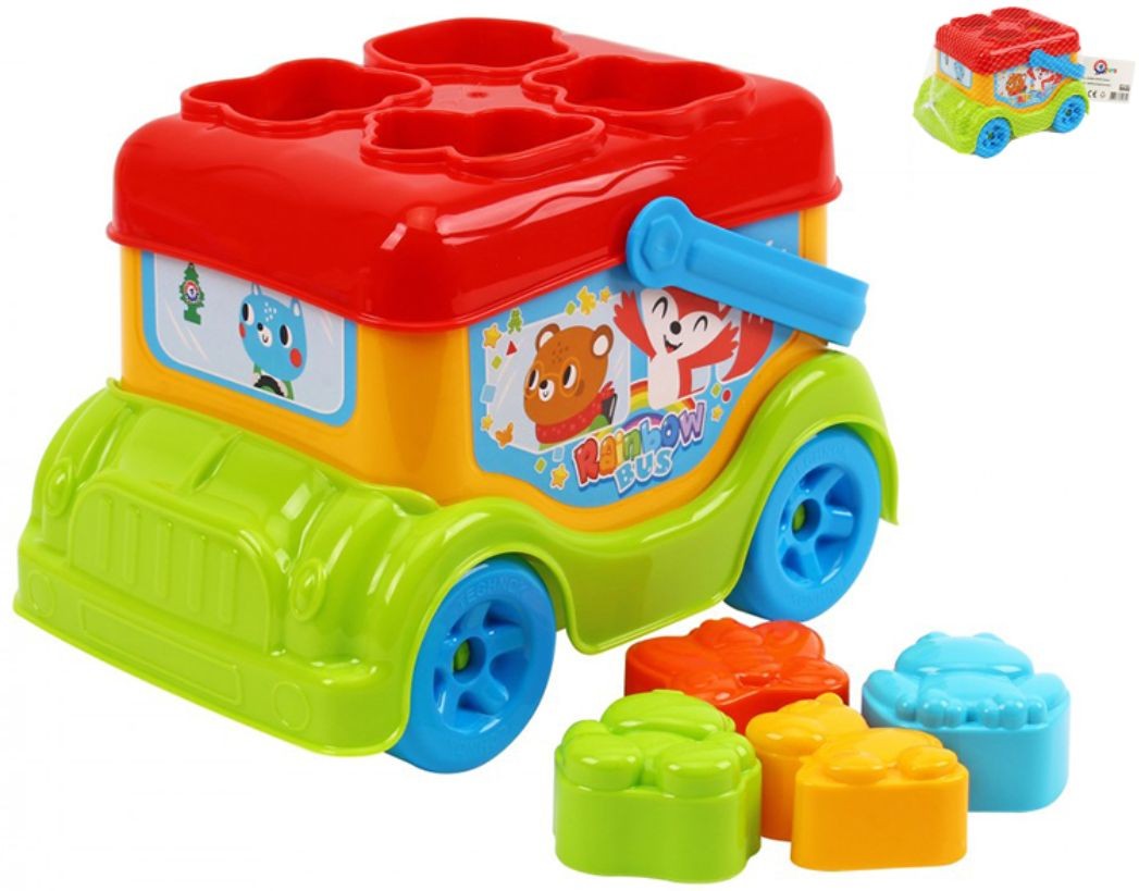 Barevná vkládačka AUTOBUS se čtyřmi vkládacími tvary.