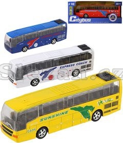 Dálkový autobus, kovový model s pohonem na zpětné natažení, pro všechny malé řidiče, ve čtyřech variantách provedení. Hračka na baterie, se světlem a zvukem. Baleno v krabici.