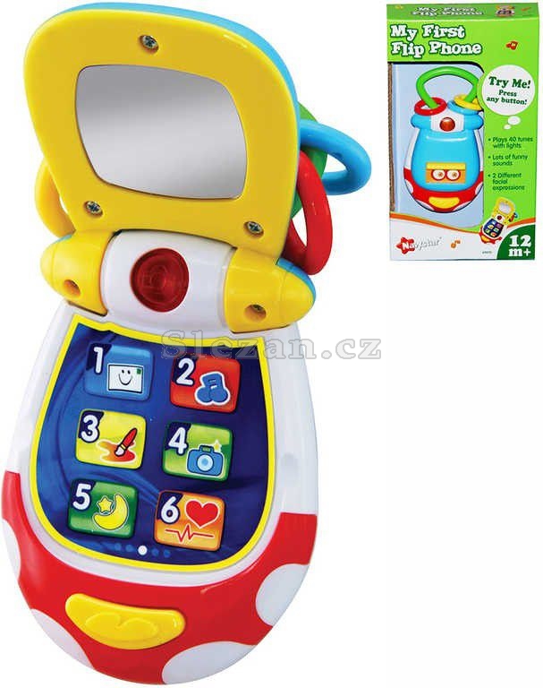 Můj první vyklápěcí mobilní telefon – dětské "véčko" pro ty nejmenší telefonisty. Telefonek hraje 40 tónů, svítí, vydává legrační zvuky. Hračka na baterie, se světlem a zvukem. Baleno v krabici.