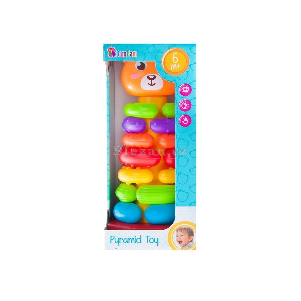 Skládačka s hlavou medvídka na jejím vrcholu, zaujme svým barevným zpracováním především nejmenší děti. Pyramida je tvořena z několika veselých plastových prstenců, které děti vrství na sebe a přitom si rozvíjí a procvičují motoriku a schopnosti kombinování. Skládačka ze sedmi barevných tvarů zavede vaše ratolesti do světa plného velikostí a barev na dlouhé hodiny plné zábavy a nových dovedností.Jedná se o hračku firmy Bam Bam, jejichž výrobky se vyznačují vysokou kvalitou, bezpečností pro Vaše děti a barevností.Hračky pro miminka mají krásný vzhled, jsou lehké a navíc fungují jako aktivní hračky - stimulují dítě vizuálně i prostřednictvím hmatu.Rozměry balení (š v h): 13 x 29,5 x 13cmRozměry dětské hračky (š v): 11 x 28cmMateriál: plastObsah balení: základna s hlavou zvířátka, navlékací tvary 7ks.Určeno od 6 měsíců.