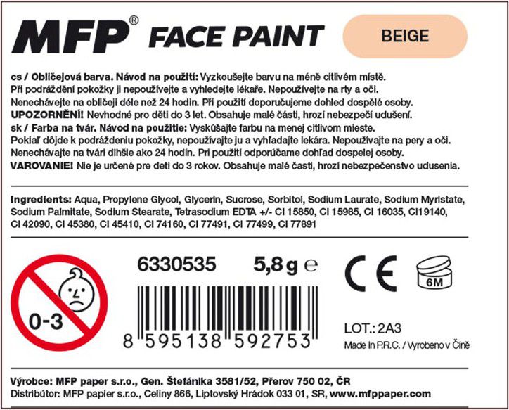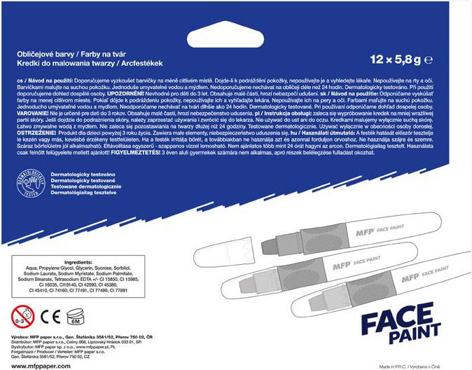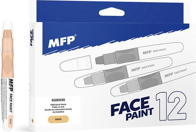 Barva na obličej béžová, na principu rtěnky (6 g). Díky těmto pestrým barvám vykouzlíte na tváři dítěte krásnou masku na karneval, párty nebo jinou oslavu. Dermatologicky testováno. Barva: béžová NÁVOD NA POUŽITÍ: 1. Doporučujeme vyzkoušet barvičky na méně citlivém místě. 2. Dojde-li k podráždění pokožky, nepoužívejte a vyhledejte lékaře. 3. Nepoužívejte na rty a oči. 4. Barvičkami malujeme na suchou pokožku. 5. Jednoduše omyvatelné vodou a mýdlem, barvy zdravotně nezávadné. 6. Nedoporučujeme nechávat na obličeji déle než 24 hodin. 7. Při použití doporučujeme dohled dospělé osoby. VAROVÁNÍ: Nevhodné pro děti do 3 let, nebezpečí spolknutí malých částí. Všech 12 ks je baleno v papírové krabičce. Uvedená cena je za 1 ks.