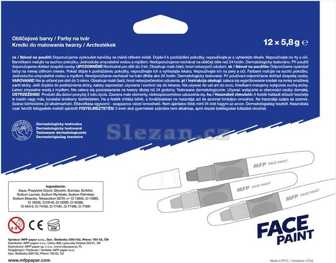 Barva na obličej oranžová, na principu rtěnky (6 g). Díky těmto pestrým barvám vykouzlíte na tváři dítěte krásnou masku na karneval, párty nebo jinou oslavu. Dermatologicky testováno. Barva: oranžová NÁVOD NA POUŽITÍ: 1. Doporučujeme vyzkoušet barvičky na méně citlivém místě. 2. Dojde-li k podráždění pokožky, nepoužívejte a vyhledejte lékaře. 3. Nepoužívejte na rty a oči. 4. Barvičkami malujeme na suchou pokožku. 5. Jednoduše omyvatelné vodou a mýdlem, barvy zdravotně nezávadné. 6. Nedoporučujeme nechávat na obličeji déle než 24 hodin. 7. Při použití doporučujeme dohled dospělé osoby. VAROVÁNÍ: Nevhodné pro děti do 3 let, nebezpečí spolknutí malých částí. Všech 12 ks je baleno v papírové krabičce. Uvedená cena je za 1 ks.