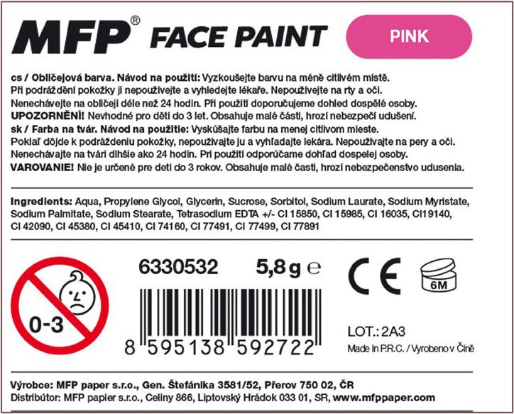 Barva na obličej růžová, na principu rtěnky (6 g). Díky těmto pestrým barvám vykouzlíte na tváři dítěte krásnou masku na karneval, párty nebo jinou oslavu. Dermatologicky testováno. Barva: růžová NÁVOD NA POUŽITÍ: 1. Doporučujeme vyzkoušet barvičky na méně citlivém místě. 2. Dojde-li k podráždění pokožky, nepoužívejte a vyhledejte lékaře. 3. Nepoužívejte na rty a oči. 4. Barvičkami malujeme na suchou pokožku. 5. Jednoduše omyvatelné vodou a mýdlem, barvy zdravotně nezávadné. 6. Nedoporučujeme nechávat na obličeji déle než 24 hodin. 7. Při použití doporučujeme dohled dospělé osoby. VAROVÁNÍ: Nevhodné pro děti do 3 let, nebezpečí spolknutí malých částí. Všech 12 ks je baleno v papírové krabičce. Uvedená cena je za 1 ks.
