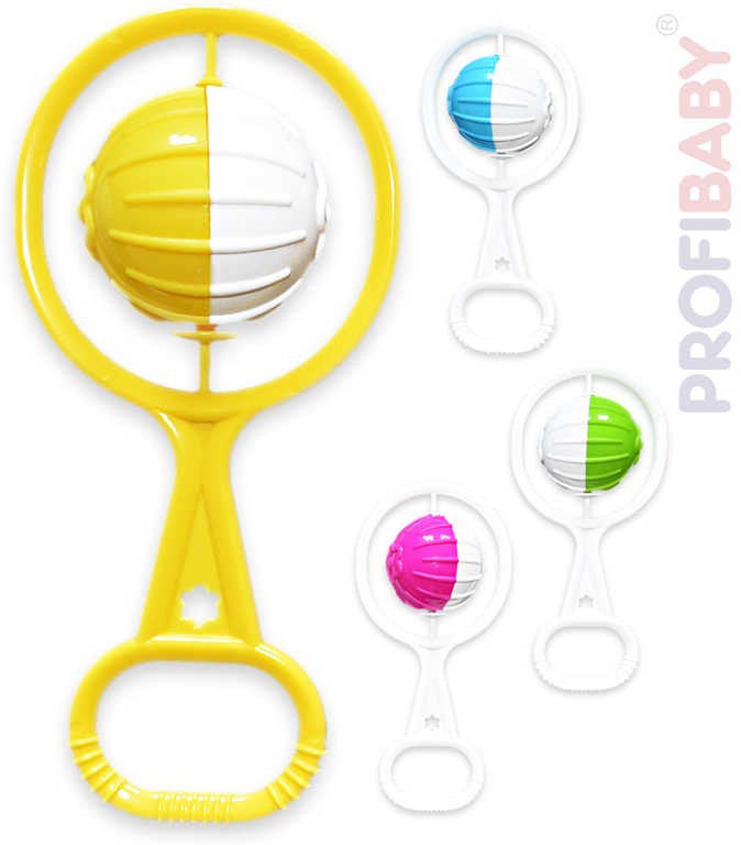 Klasické dvoubarevné chrastítko s ručkou z plastu v retro stylu, pro nejmenší děti, ve dvou barevných kombinacích.