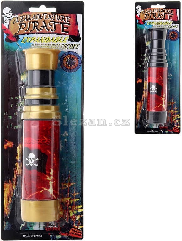 Parádní dětský vysunovací dalekohled z plastu, s motivem pirátské vlajky s lebkou, je nezbytným doplňkem každého malého piráta.