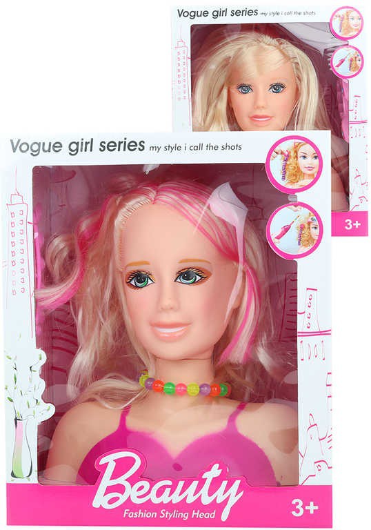 Krásný kadeřnický set v podobě hlavy s blonďatými vlásky na česání, ve dvou variantách provedení, obsahující nezbytné doplňky, pro všechny malé kadeřnice.