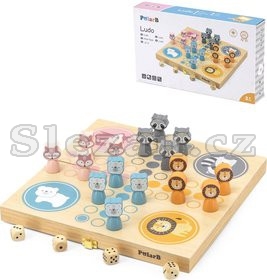 Dřevěná společenská hra Člověče nezlob se! Figurky ve tvaru zvířátek. Rozkládací herní plocha. Baleno v krabici.