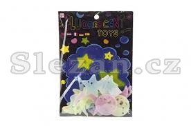 Pěkný fosforeskující set s tvary různých barev, které svítí ve tmě - dekorace do dětského pokojíčku. Baleno na kartě.