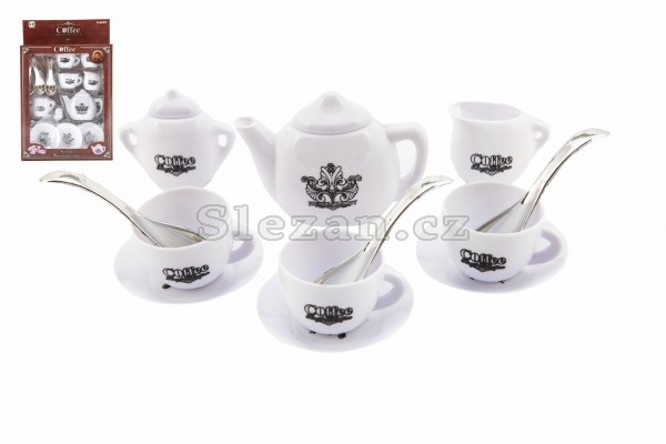 Sada obsahuje 3 šálky s podšálky, lžičky, konvičku s víčkem, menší konvičku na smetanu a cukřenku.
