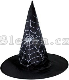Čarodějnický dětský klobouk "Pavučina" - černý s bílou ozdobnou pavučinkou.