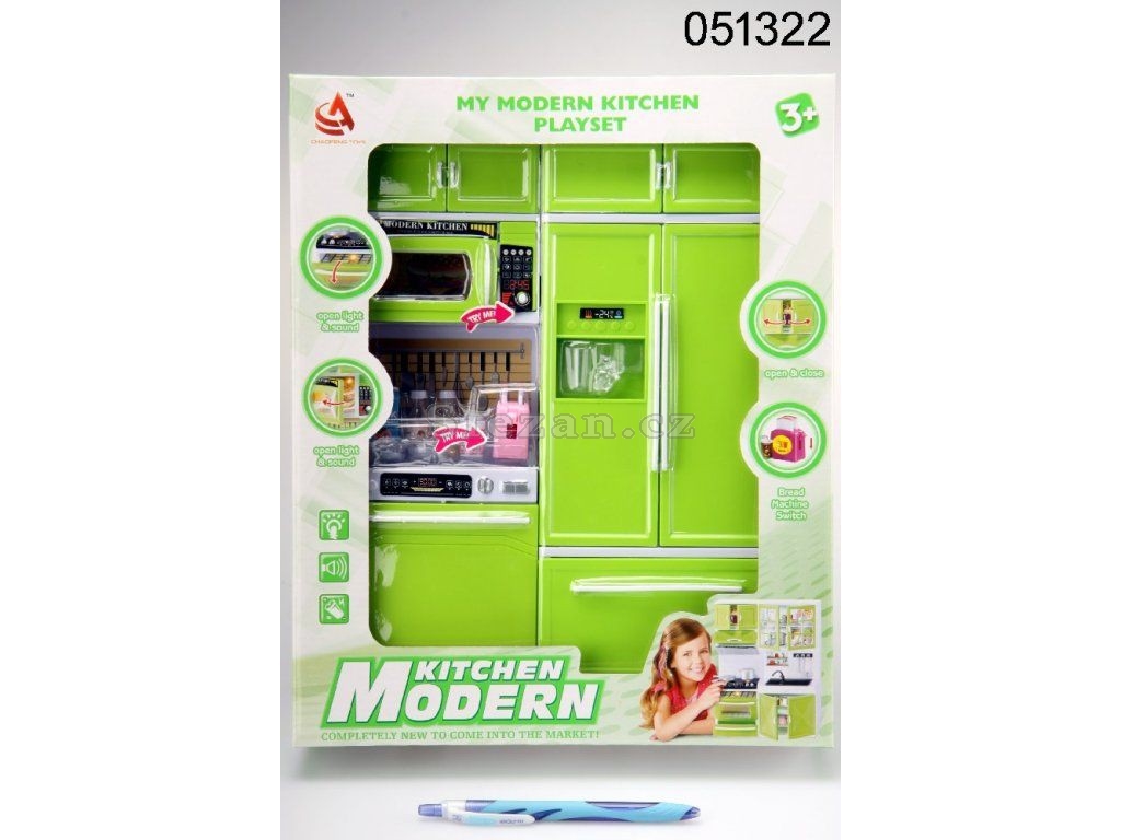 To se bude dobře vařit panenkám v moderní kuchyni. Moderní zelená kuchyně se zvukem a světlem s lednicí a mikrovlnnou troubou. Při otevření trouby se rozsvítí světlo. Vybavení kuchyňské linky dle fotografie součástí.