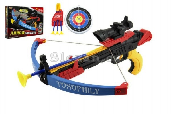 Barevná plastová kuše se třemi šípy a terčem nabízí bezpečnou střelbu na cíl.