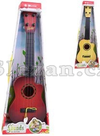 Plastová napodobenina klasické akustické kytary - španělky. Dětský hudební nástroj se čtyřmi strunami a funkčními ladícími kolíky, ve dvou barevných variantách, pro všechny malé muzikanty. Součástí