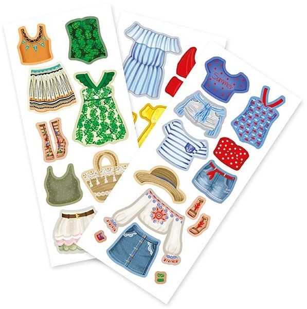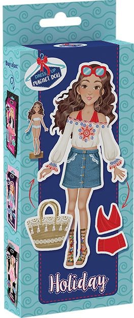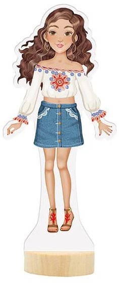 Balení obsahuje oblékací postavičku, 3 archy magnetických částí oblečení, bot a doplňků a dřevěný podstavec.