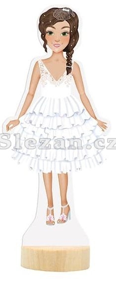 Balení obsahuje: oblékací postavičku, 3 archy magnetických částí oblečení, bot a doplňků a dřevěný podstavec.