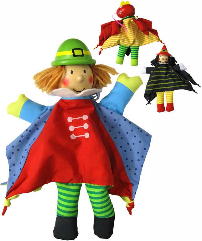 Krásný textilní maňásek na prst ve veselých barvách s dřevěnou hlavičkou, potěší každé malé dítě. Tělíčko připomíná kapesník s uzly. Vybrat si můžete ze tří druhů pohádkových postaviček (princ, drak, čaroděj).