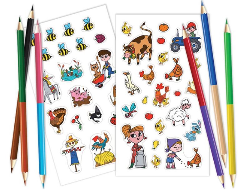 Omalovánky obsahují 96 stran nejrůznějších aktivit, 2 listy samolepek a 6 oboustranných pastelek.