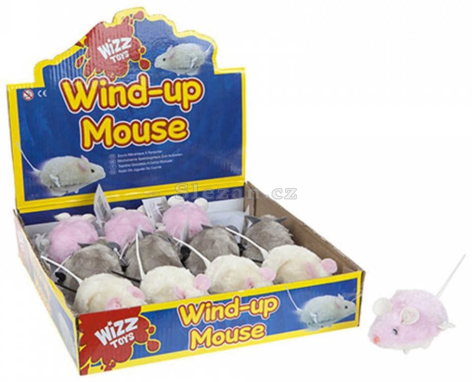Klasická dětská hračka v podobě malé myšky z plyše a plastu na natažení, na klíček, ve třech barevných variantách.