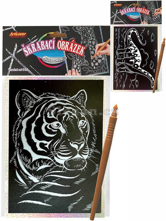Škrabací kresby s hologramovým podkladem, v osmi variantách motivu. Součástí balení je i plastové rydlo.