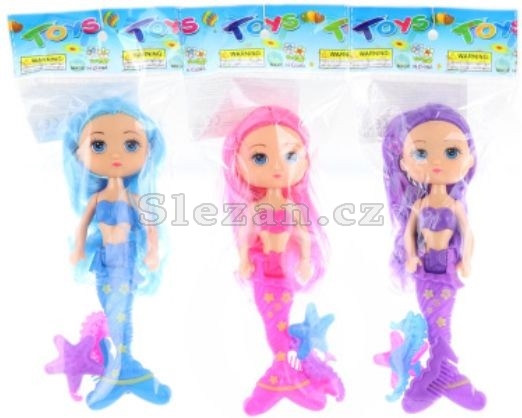 Malá panenka mořské panny o velikosti cca 18 cm s hřebínkem a dalšími doplňky.