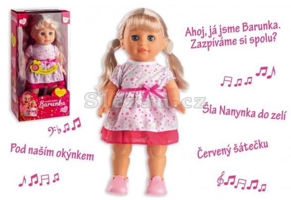 Po stisknutí tlačítka na bříšku začne panenka chodit a zpívat: "Ahoj, já jsem Barunka. Zazpíváme si spolu?...Šla Nanynka do zelí…, Pod naším okýnkem..., Červený šátečku...