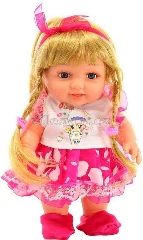 Panenka s blonďatými vlásky, s copánky a mašlí ve vlasech, ve veselých šatičkách. Má pohyblivé ruce, nohy a hlavu. Šaty lze sundat - na suchý zip. Baleno v plastovém sáčku.