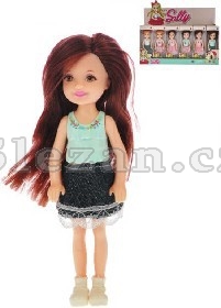 Roztomilá panenka Sally v letním oblečku v plastovém triku bez rukávů a krátké textilní sukénce,