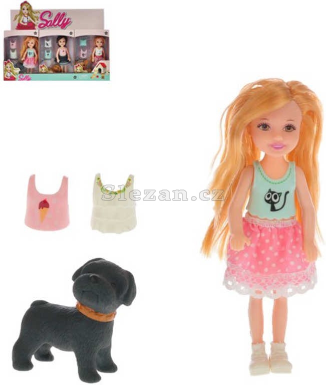 Roztomilá panenka Sally v letním oblečku v plastovém triku bez rukávů a krátké textilní sukénce, v pěti variantách provedení. Baleno v krabičce.