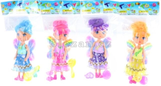 Plastová panenka víla s duhovými křdly spolu s hřebínkem a sponkou.