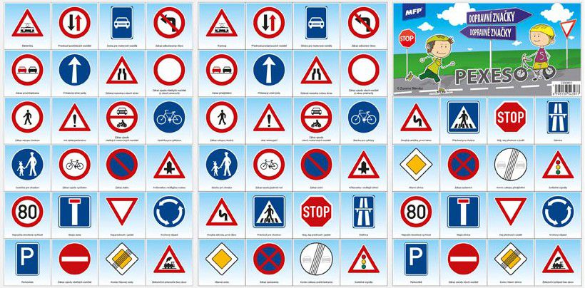 - Pexeso se skládá ze tří A4, na kterých najdete 64 kartiček s obrázky dopravních značek a návod ke hře - kartičky jsou s českými i slovenskými názvy.